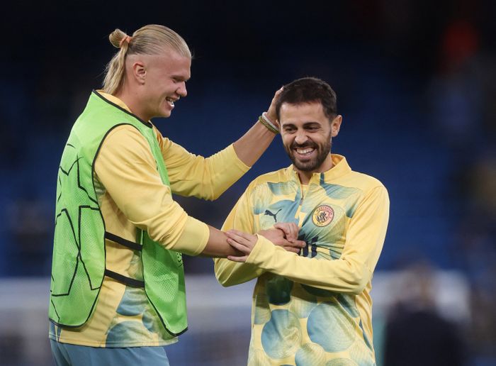 Erling Braut Haaland og Bernardo Silva i oppvarming. Foto: