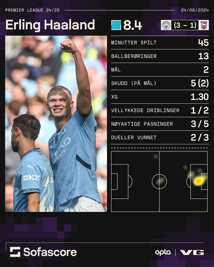 Velkommen! Her kan du følge livedekningen av Man. City – Ipswich. Haaland starter, selvfølgelig.