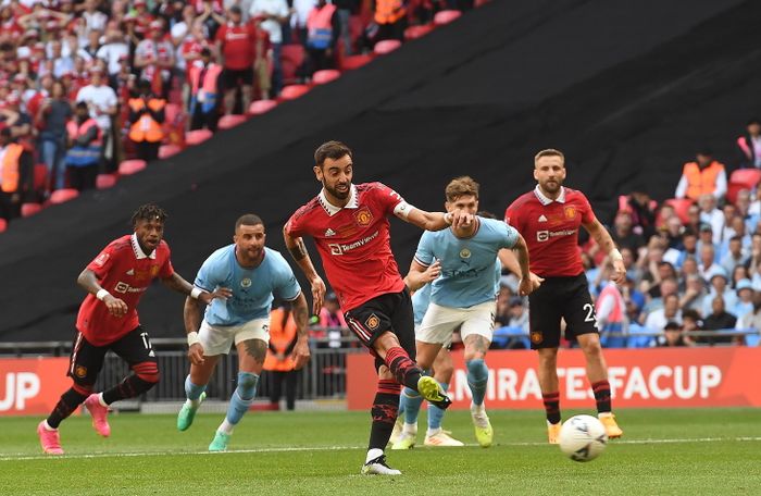 Triller den sikkert i mål! Steppeshow frem til straffemerket av Bruno Fernandes, før han sender ballen til venstre. Ortega går motsatt vei, og utligningen er et faktum. Foto: EPA.
