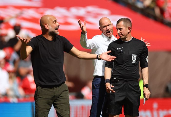 Det dømmes straffe! Grealish fortviler. Manchester United har fått straffespark på Wembley.