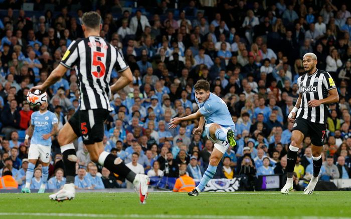 PANG! Álvarez banker City i ledelsen! Foden spiller inn til Álvarez, som har masse rom. Argentineren tar et touch, før han banker ballen i det lengste hjørnet. Praktfull avslutning! Foto: Reuters.