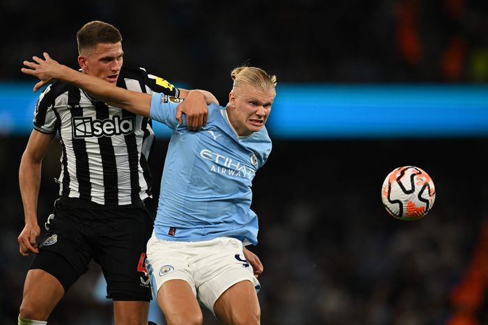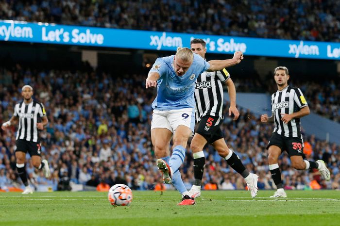 Haaland kommer til skudd, men presset av Newcastle-forsvaret blir det ikke all verden til klem i det. Ballen kommer i hvert fall lenger enn blokka, og treffer mål. Bare scoringen til Álvarez som hadde gjort det tidligere i kampen. Pope få problemer med å redde denne. Foto: AFP.