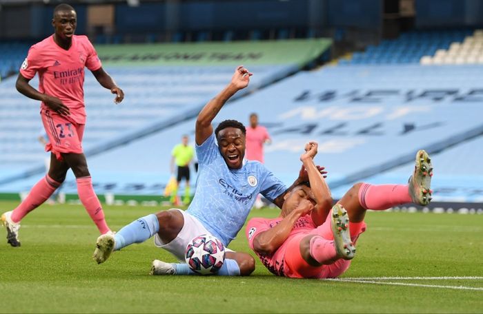 Sterling går i bakken innenfor Real Madri-boksen. Får ingenting.