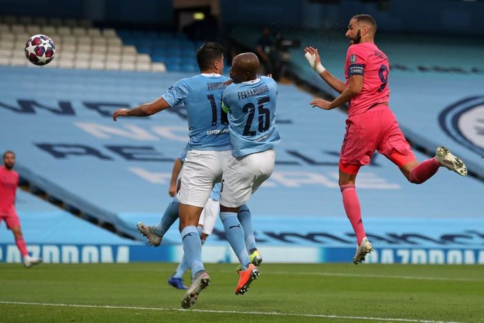 UTLIGNING - OG REDUSERING! Karim Benzema, Real Madrids toppscorer, stiger til værs og stanger ballen i mål etter et perfekt innlegg fra Rodrygo! Fantastisk heading av franskmannen som er omringet av City-spillere inne i boksen. Foto: AFP.