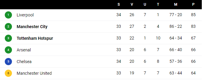 Slik er altså den høyinteressante kampen om både tittelen og topp seks i Premier League: