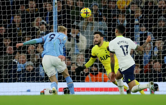 Lewis slår inn mot Haaland, men nordmannen timer innlegget dårlig og får en liten dytt fra Emerson. 5-meter til Spurs.