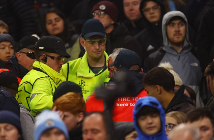 Funksjonærene sjekker en blodig Manchester City-supporter. Foto: Reuters.