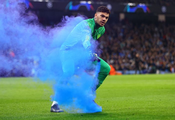 Ederson kaster bort et bluss, som er kastet inn på banen. Foto: Reuters