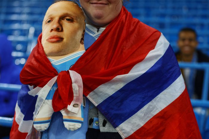 Manchester City-supporter med Haaland-dukke og norsk flagg før tirsdagens kamp. Foto: Reuters