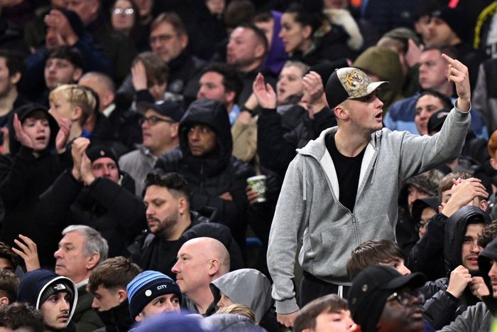 En sint Manchester City-supporter viser fingeren til gjestenes fans. Foto: AFP