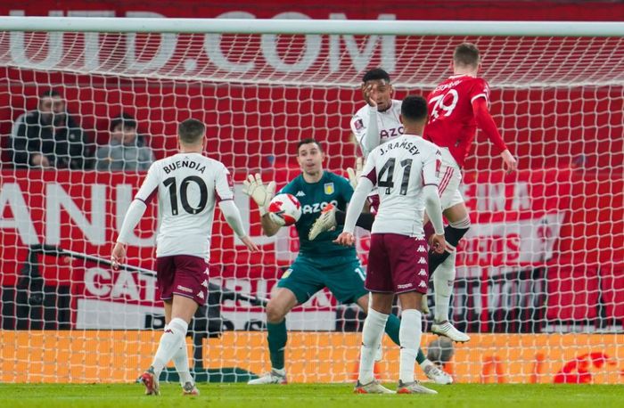 McTominay tester skuddfoten. Det er vel 20 meter. Skuddet går via en Villa-forsvarer, men keeper Martinez har god kontroll på det.