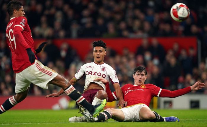Lindelöf med grusom tabbe, mister ballen til Watkins som skyter og treffer tverrliggeren. Foto: PA Photos