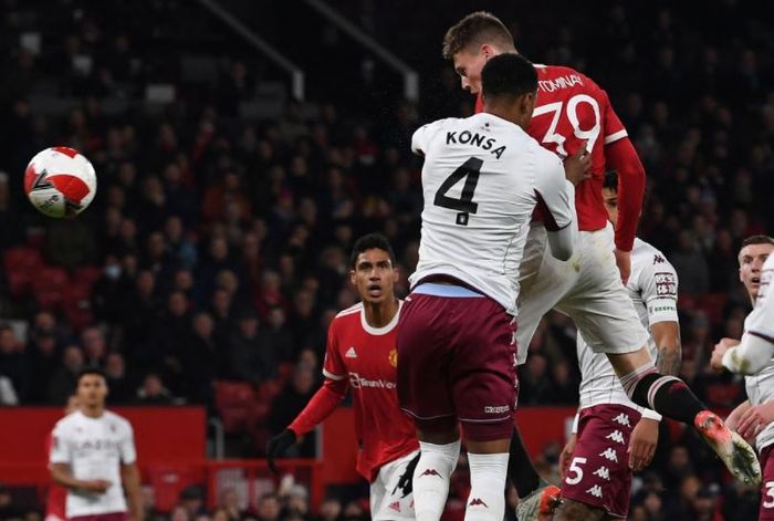 Konsa går ned i feltet, får armen til Luke Shaw i ansiktet. Dommer Oliver vinker ham opp.