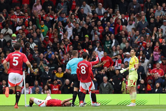 Målsjanse til Manchester United FC! Bruno Fernandes treffer mål, men keeper redder.