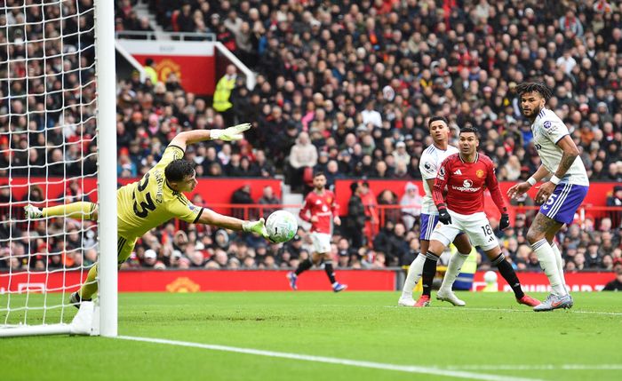 Dalot finner seg alene i Villa-boksen. Får en lang ball mot seg, men får ikke hodet på ballen. Via skulderen går den mot mål, men Martinez får kontroll på den.