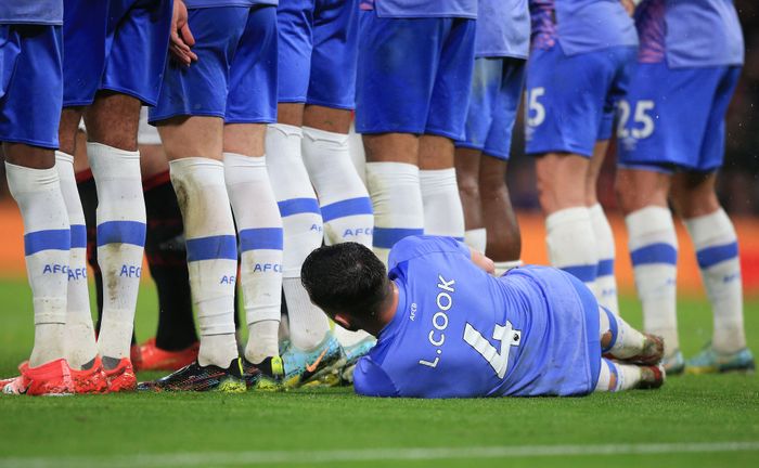 To Bournemouth-spillere ligger nede etter duell med van de Beek. Det er Jefferson Lerma og Philip Billing.