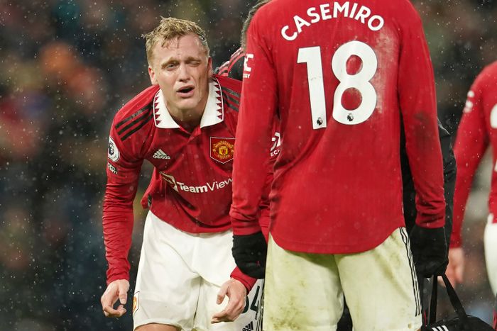 Heldigvis kommer Van De Beek seg på beina. Men han halter og har fryktelig vondt.