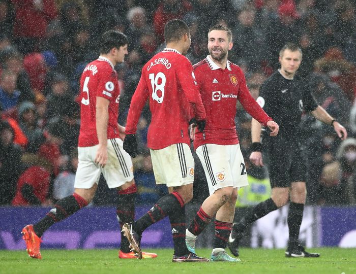 Målscorerne Luke Shaw (t.h.) og Casemiro gratulerer hverandre. Foto: EPA
