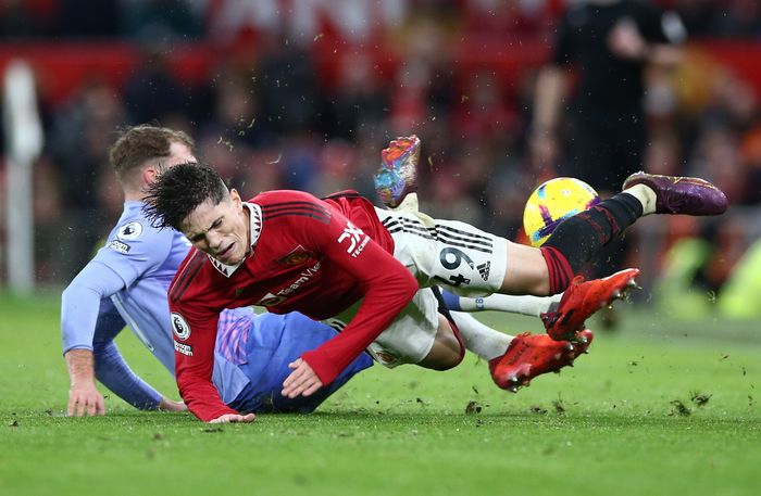 Garnacho blir sparket ned av Stacey. Det ender med gult kort for Bournemouth-spilleren. Foto: EPA
