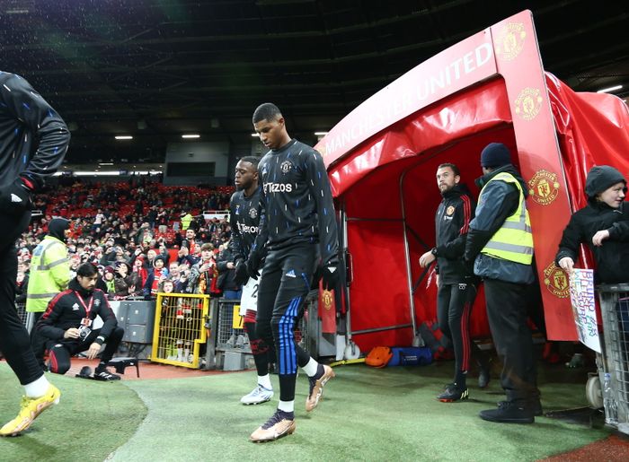Marcus Rashford rusler inn på arenaen til oppvarming. Foto: EPA