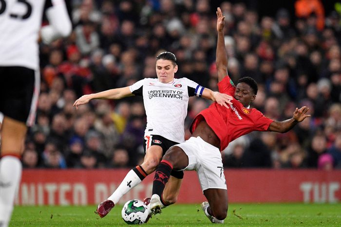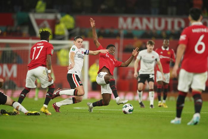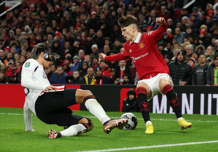 Sean Clare, som spiller med ansiktsmaske, får en smell i duell med Heaton. I forbindelse med utboksingen på corneren, treffer Uniteds sisteskanse den fra før Garnacho-svimle backen i hodet.