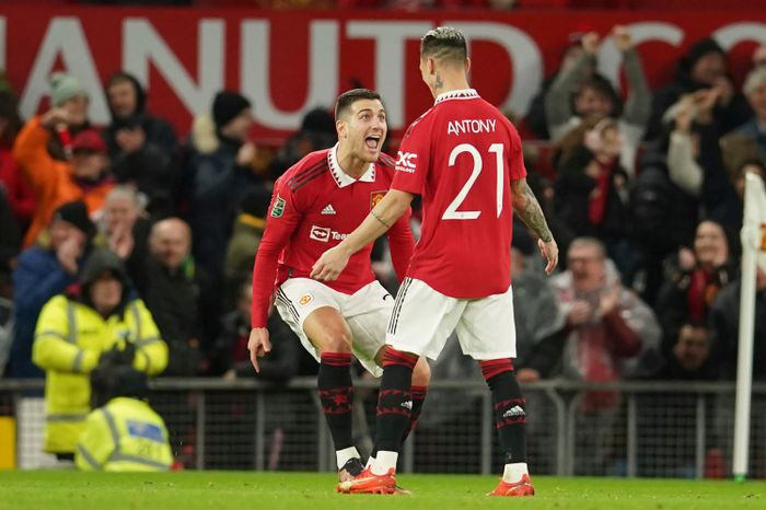 United går rett i angrep. Garnacho drar seg forbi på venstresiden og slår 45 grader ut til Dalot. Høyrebacken bruker venstrefoten og curler ballen like over.