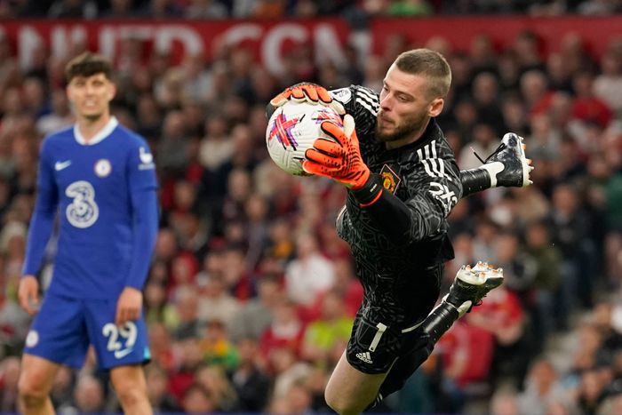 Så må De Gea i aksjon! Først redder han glitrende et forsøk fra Hall, så må han gjøre en ny god redning på skudd fra Mudryk.