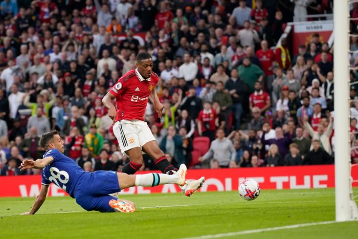 Anthony Martial setter inn 2-0. Chelseas Cesar Azpilicueta kommer for sent. Foto: AP