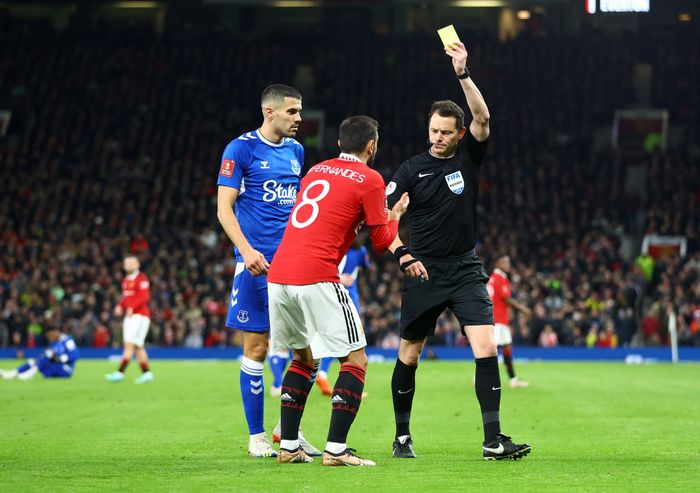 Fernandes med en ufin stempling på Onana eller Gray. Beklager at jeg ikke så det helt. Unødvendig og veldig ufint var det uansett. Får gult. Fortjent. Foto: EPA