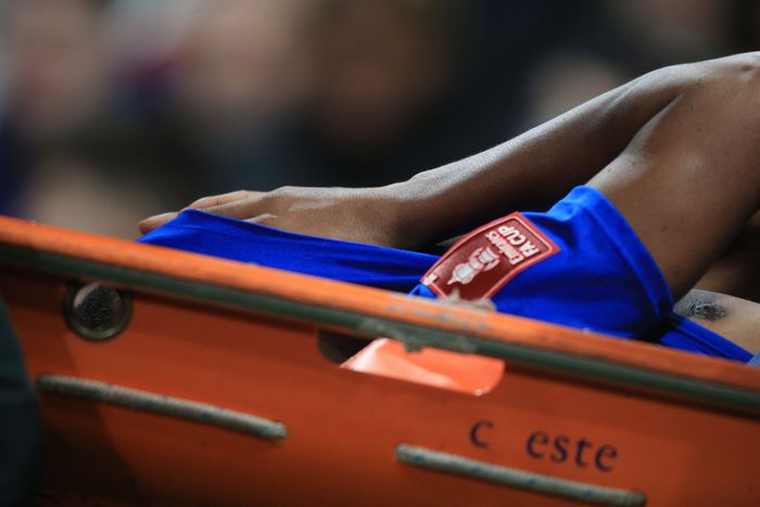 Everton sliter med klareringen, men vinner ballen tilbake. Men der ligger Onana nede. Holder seg på venstre fot. Han får Casemiros ben inn i venstre legg.