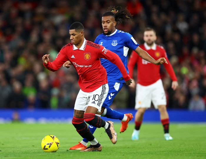 Rashford tar med seg ballen fra midtbanen, skyter fra rundt 25 meter. Bra skudd, men Pickford er for god for den der. Foto: REUTERS