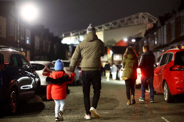 Fansen er på vei inn på stadion. Barna er med. Fotballen er fin. Og brutal noen ganger. Så får vi se om det er Manchester United- eller Everton-fansen som går plystrende og lystig hjem fra Old Trafford. Foto: Reuters