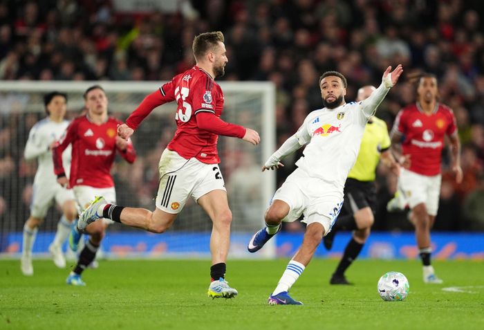Leeds får headet ut. Dalot prøver seg fra distanse, langt over mål.