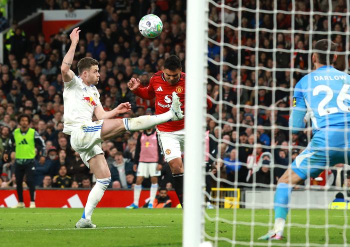 Nå er hjemmelaget så nære en utligning! Casemiro vinner i feltet og header forbi Darlow. På streken står Calvert-Lewin og redder Leeds.