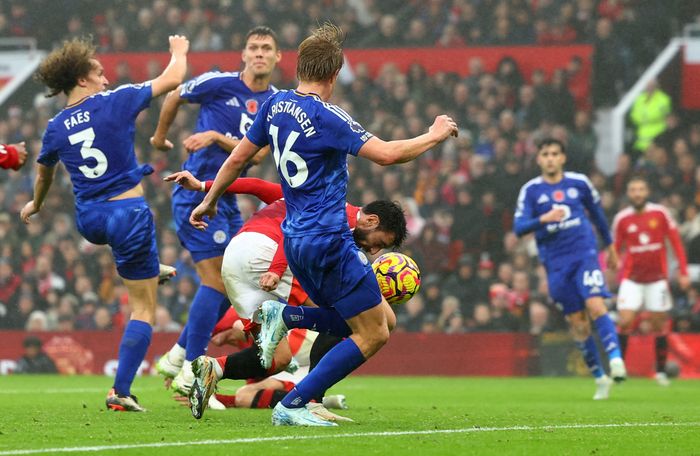 United spiller seg rundt på venstrekanten. Mazraoui får slått inn, men Leicester rydder opp.