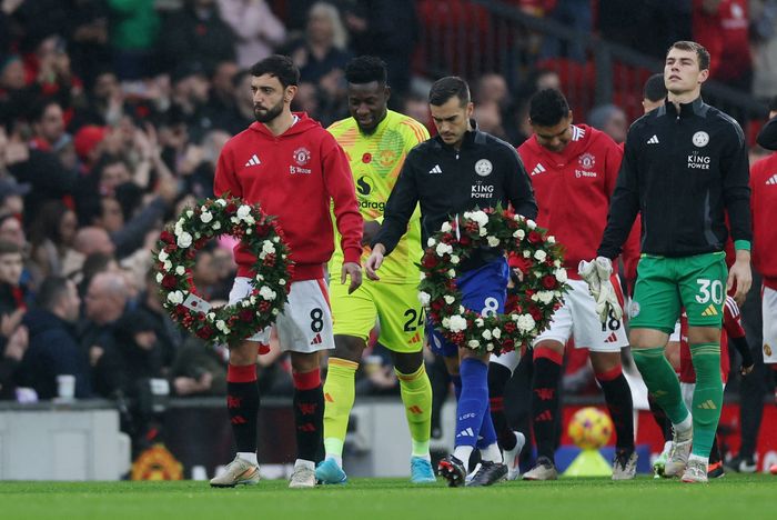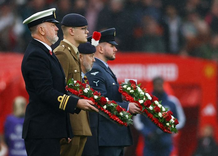 Lagene er på vei ut på banen. Remembrance Day skal markeres før avspark til minne for soldater som har falt i strid.