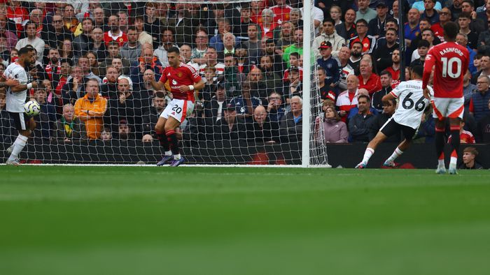 Nesten for Liverpool! Szoboszlai har en enorm skuddposisjon i 16-meteren til United, men han nøler og bruker for lang tid med ball. Der er det bare å skyte, gutt! United slipper unna med skrekken. Utrolig godt forarbeid.