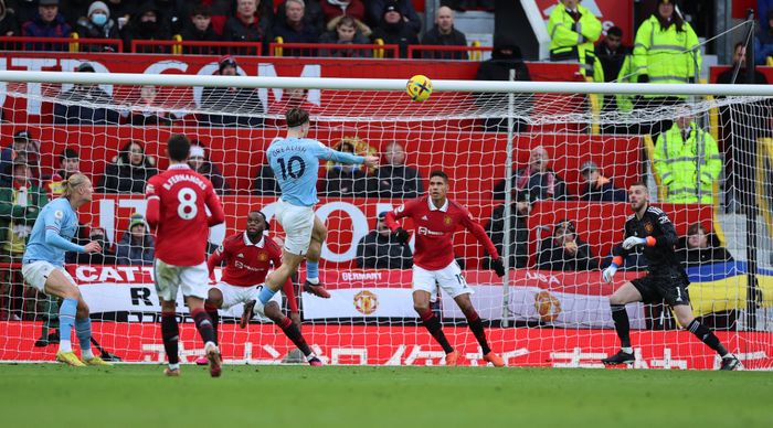 Stopper Grealish. Frispark til gjestene på Uniteds halvdel.