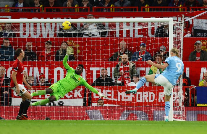 Nesten hat trick for Haaland! Det er Grealish som sender Haaland alene gjennom. Nordmannen tar et touch, før han prøver å chippe ballen over Onana, men keeperen er med på notene og redder. Corner!