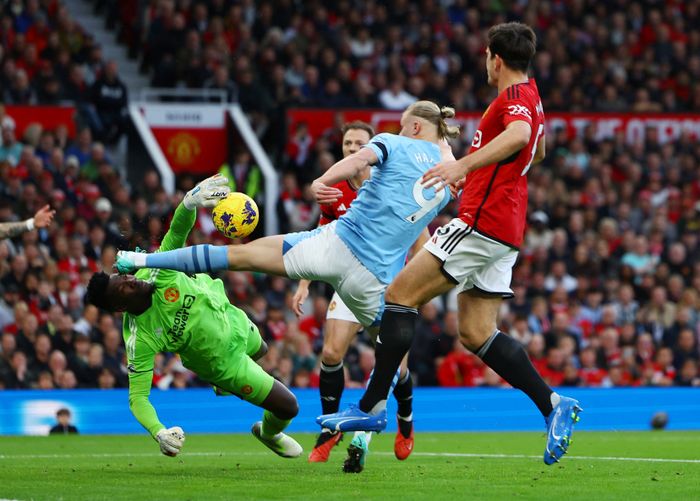 Ballen slås i bakrom mot Haaland, som har løpt fra forsvaret, men Onana er våken og får banket unna ballen. Han var i onside der, nordmannen.