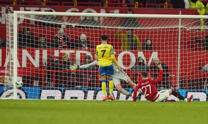 Manchester United starter returkampen med et tilnærmet toppet lag, Marcus Rashford og David de Gea starter på benken. Tom Heaton står i mål, mens Weghorst starter i midten på top, Antony og Garnacho på hver sin side.