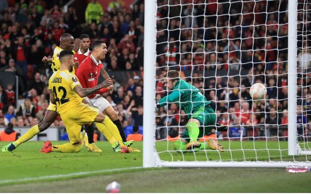Kjempesjanse for Ronaldo! Lindelöf slår en glimrende ball på Fernandes, som header ned til Ronaldo. Spissen får ikke avsluttet ordentlig fra svært kort hold, og Sheriff får klarert!