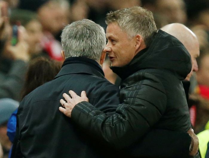 TV-bildene viser Solskjær og Mourinho i hyggelig samtale i spillertunellen. (Foto: Andrew Yates/Reuters)