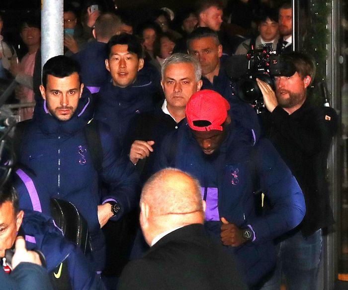 Mourinho på vei inn på Stamford Bridge sammen med Tottenham-spillerne. (Foto: Eamon And James Clarke/Pa Photos)