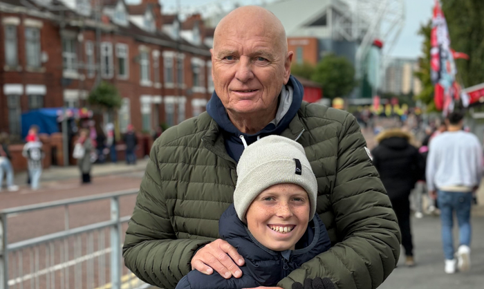 Kåre Rege Olsen er på plass på Old Trafford sammen med barnebarnet Selmer. De kommer fra Sandnes.