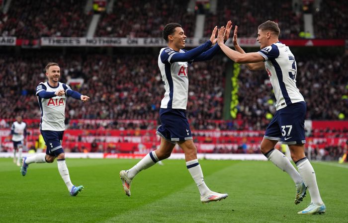 Solanke feirer mål nummer tre med Cristian Romero og Pedro Porro. Foto: Reuters