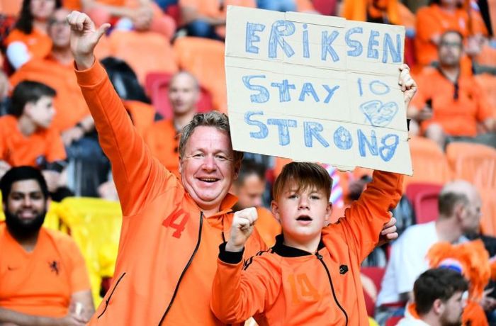 Hyggelig omtanke fra Amsterdam i retning København. To tilskuere holder frem sin beskjed til Christian Eriksen.