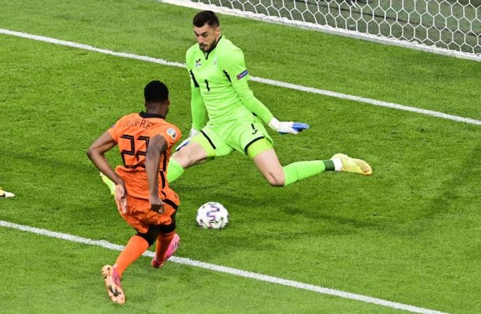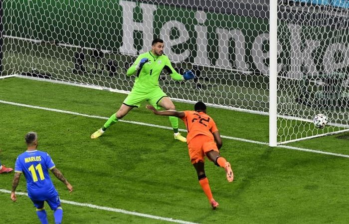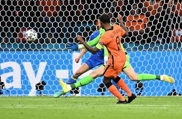 Kjemperedning av Ukrainas keeper. Det er Dumfries som får stå helt alene og kan skyte. Blir servert av Wijnaldum.