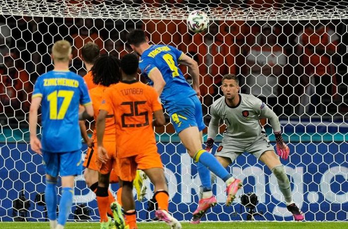 En scoring ut av intet. Det er tre ukrainere mot en haug av Nederland-spillere. Hva gjør vel det? Yarmolenko får gå innover og løfter ballen i det lengste hjørnet. Praktmål!