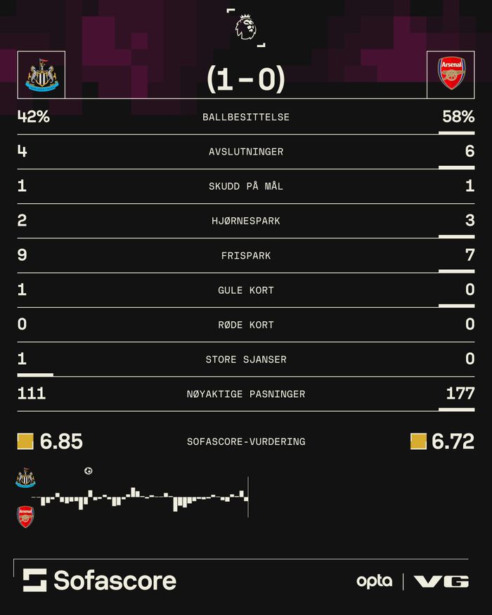 Sier litt om kampbildet de siste fem minuttene. Arsenal med en ballbesittelse på 81 prosent. Men de sliter med å bryte gjennom et svært kompakt Newcastle-forsvar.